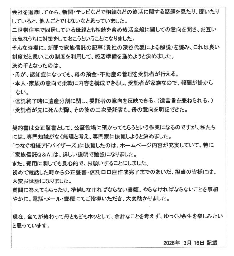 新聞記事につなぐ相続アドバイザーズ 深谷代表が掲載された家族信託の解説を読み、これはよい制度だと思い終活準備を進めようと決めました。決め手になったのは…